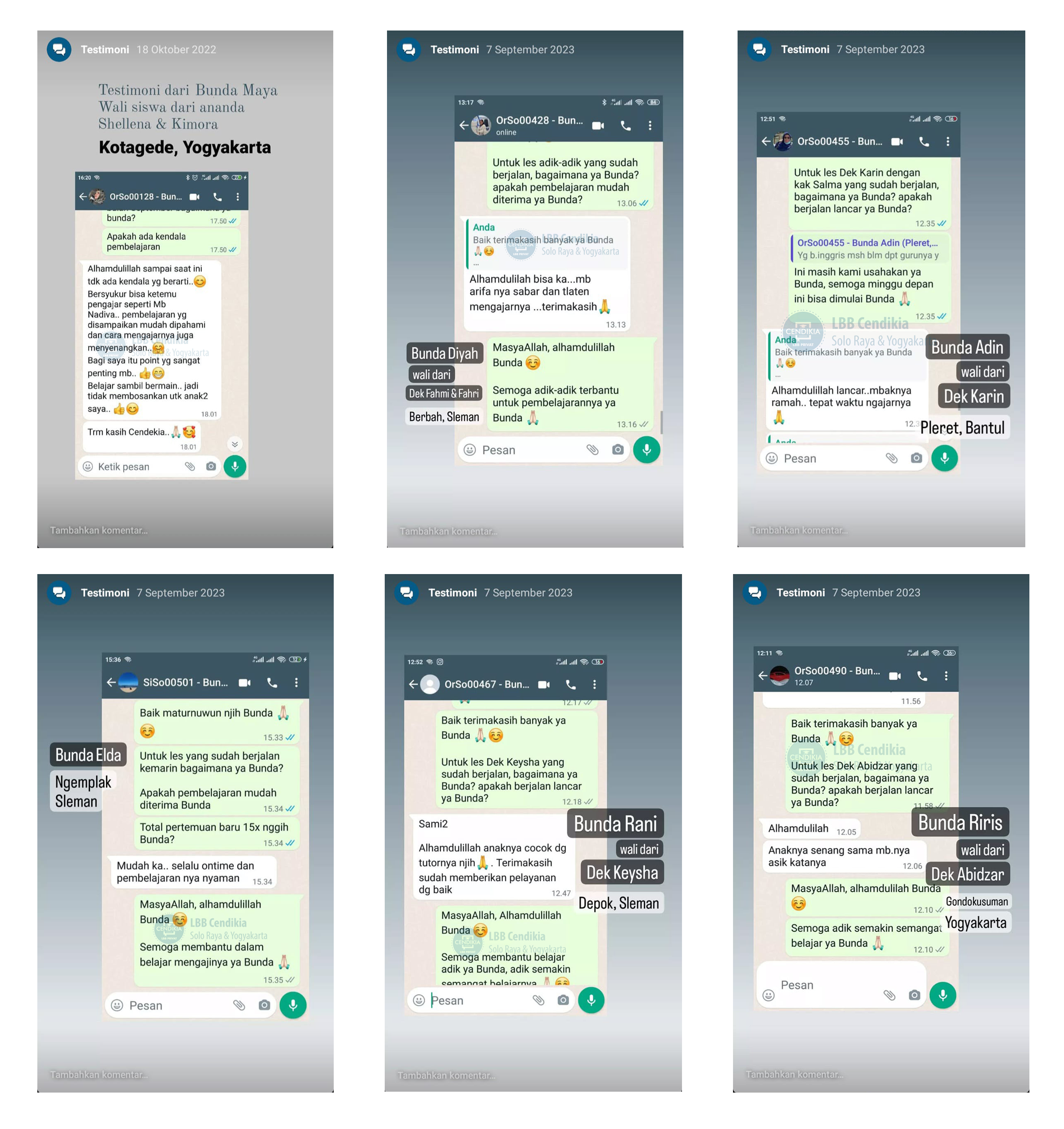Dengan pengalaman dan jaminan kualitas pembelajaran yang baik, LBB Cendikia telah dipercaya oleh banyak orang tua siswa di Yogyakarta sebagai bimbel terpercaya untuk membantu putra dan putri sebagai pendamping belajar. Dengan pilihan materi les yang beragam untuk semua jenjang pendidikan, menjadi kemudahan siswa dan wali siswa dalam menentukan materi les. Untuk orang dewasa non pendidikan formal pun juga bisa mengakses layanan bimbel privat di LBB Cendikia. Pilihan beragam guru/pengajar/tentor yang berkualitas dan mumpuni di bidangnya juga menjadi hal yang penting dalam layanan bimbel privat LBB Cendikia.