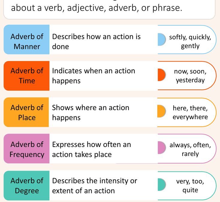 Adverb (kata keterangan) adalah salah satu bagian penting dalam Bahasa Inggris yang berfungsi untuk memberikan informasi tambahan tentang kata kerja, kata sifat, atau adverb lainnya. Artikel ini akan membahas jenis-jenis adverb beserta contoh penggunaannya.