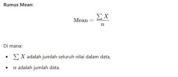 Mean atau rata-rata adalah jumlah seluruh nilai dalam data dibagi dengan banyaknya data. Mean memberikan gambaran umum mengenai data yang dianalisis.